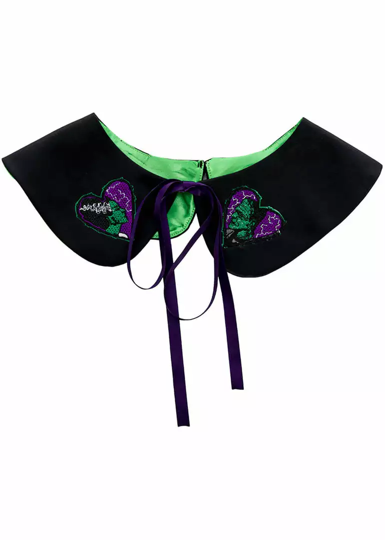 Frankenstein’s monster and his bride, both are displayed on this creepy cute collar, that closes with a ribbon in the front. The back is adorned in green satin. Perfect for a spooky-touch for every look!