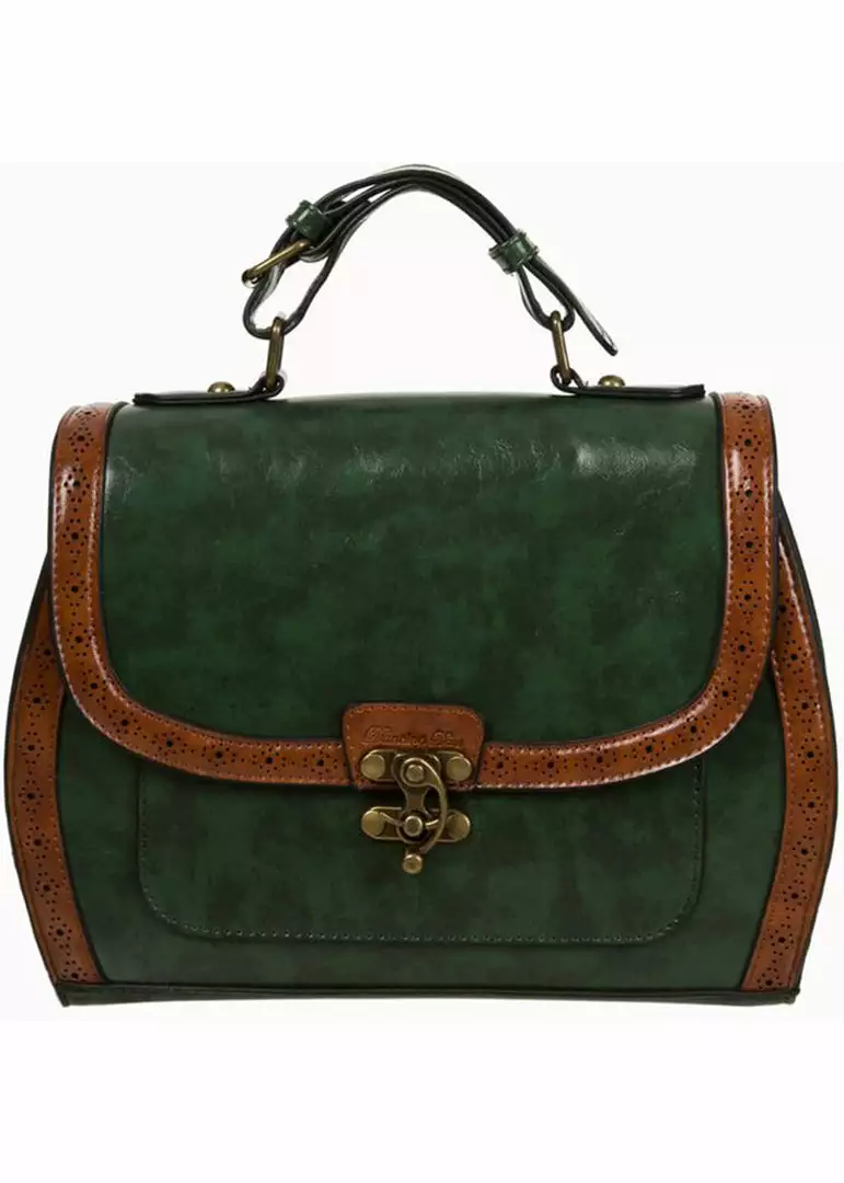 Made from a beautiful quality faux-leather she nicely keeps her shape without getting saggy. The most fun part to us it the closure, that you can slide right through… Underneath is an open front pocket, ideal for your phone. The green and brown look very classy. On the inside, which closes with a zipper, is a zipper pocket and two open pockets. She can be easily held by the handle, but for extra convenience she comes with a detachable shoulderstrap made of the same green faux-leather.