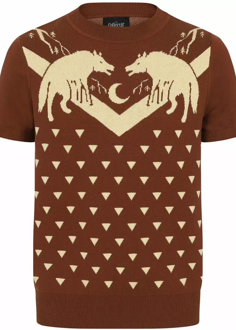 You’re seeing it right, this showstopper is made of a soft, knitted cotton giving it a slight stretch without being itchy. The motive of two wolves howling at the moon makes for the ultimate vintage look. The edges on the sleeves, top and bottom are ribbed to ensure a nice fit.