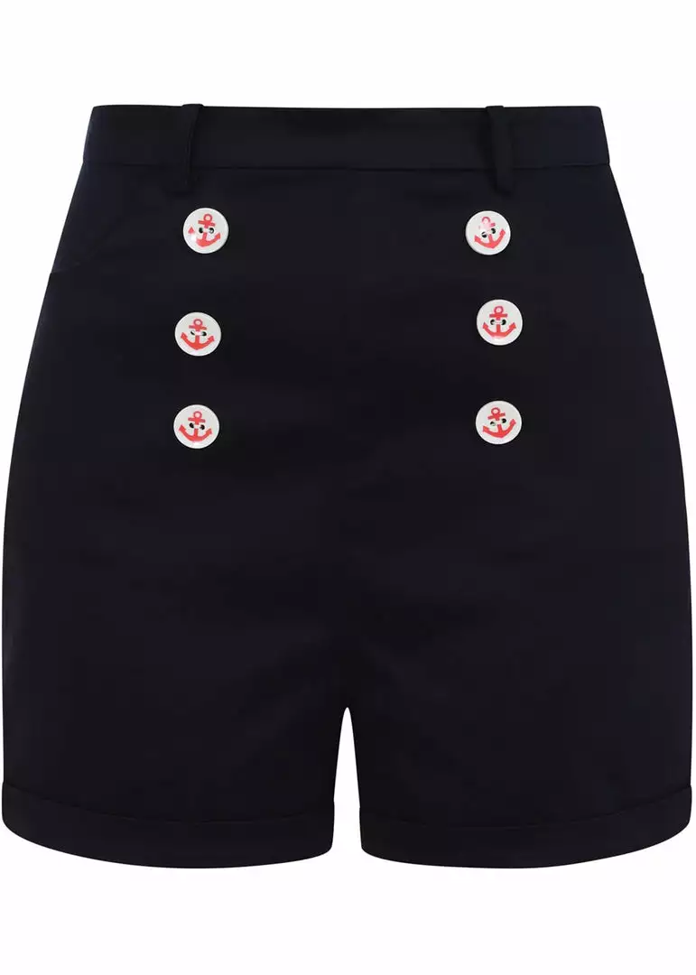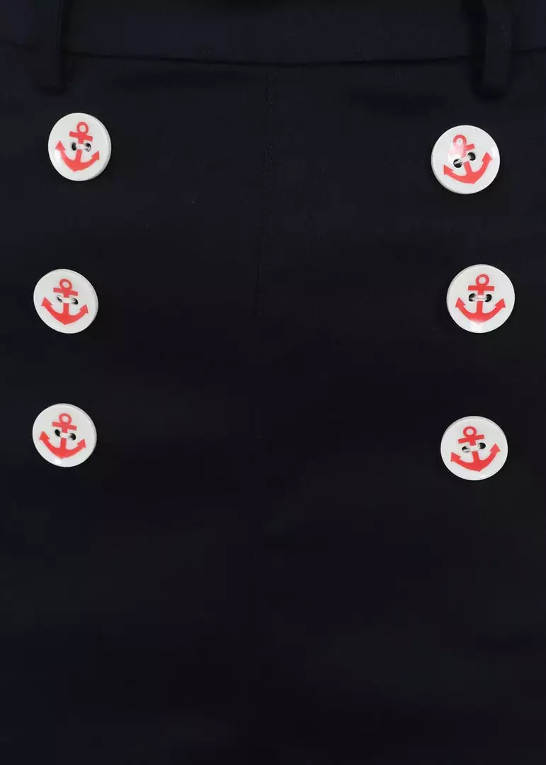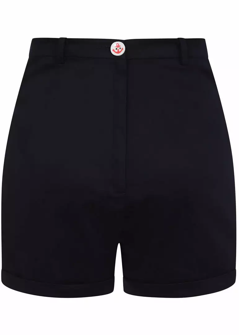 Not only the decorative buttons in the front are adorned with them, there is even one on the back! And how gorgeously lightweight she is with her fine cotton-mix with slight stretch… The high waist is accentuated by the waistband with belt loops, from where she continues closefittingly into rolled-up short legs. She closes with a zipper and a button in the back.