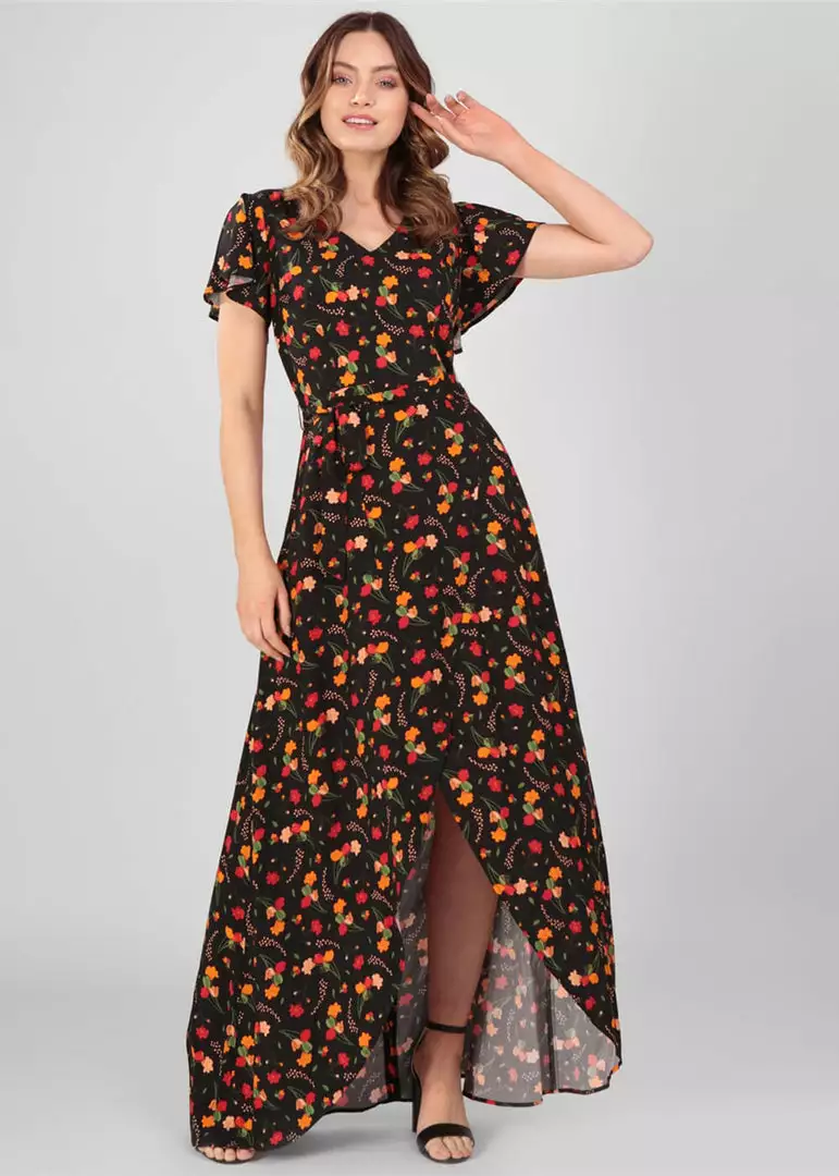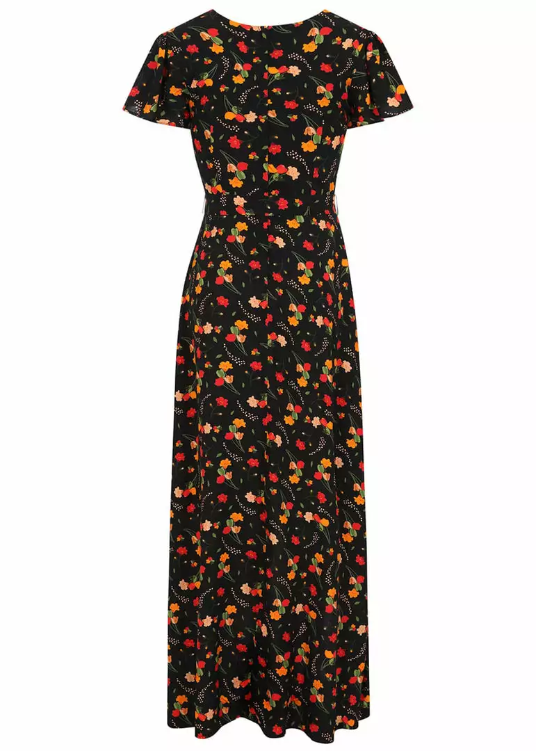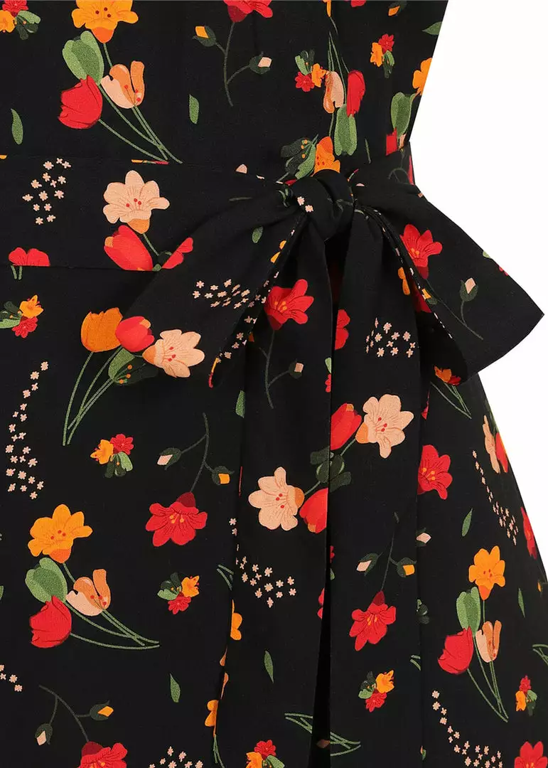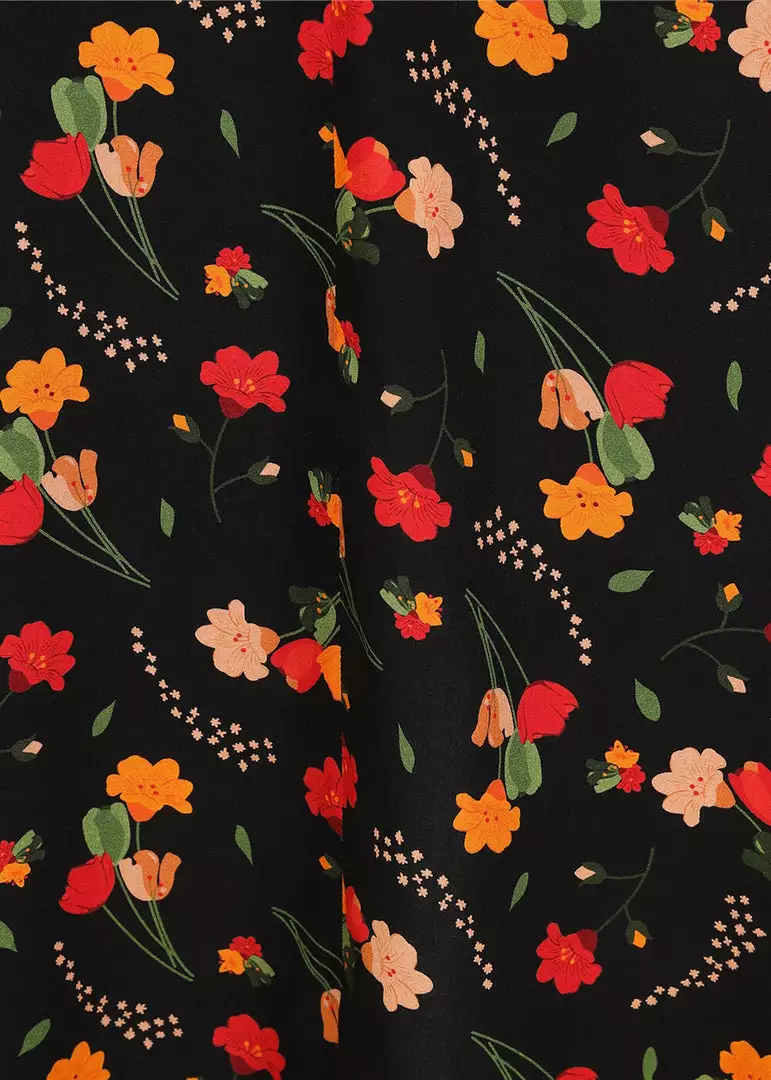 Her flowers are in our favorite warm colours, while with her airy 100% viscose with no stretch and flowy cut the only thing that’s missing is the sun.