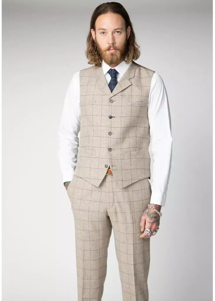 New In Gibson London Stefan Check Tweed Waistcoat Stone