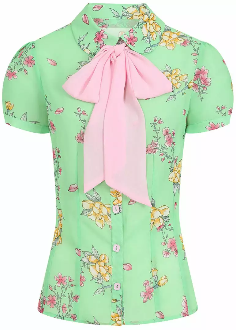 This beauty is made of a slightly transparant chiffon which looks lovely and airy and is made of chiffon with no stretch. The short sleeves are slightly puffy and even the Peter Pan collar is covered in flowers. She closes with smooth pink buttons and the amazing pink bow is detachable. Adelina is long enough to be worn with trousers, but she’s great for combining with a hight waist skirt.