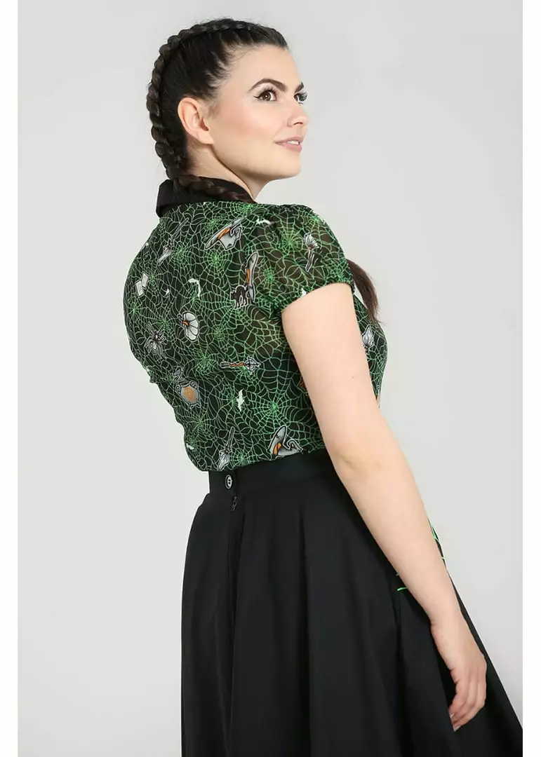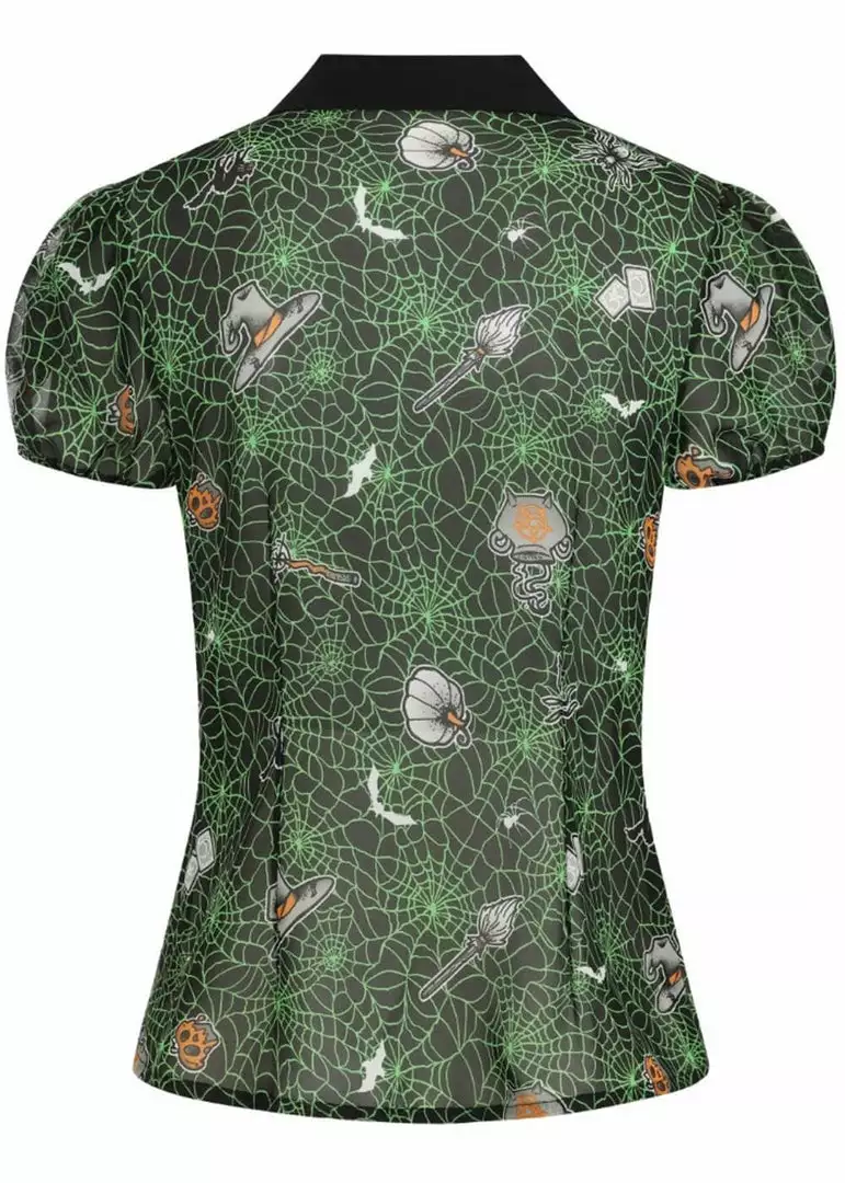 The short sleeves are joyfully puffy thanks to the fine elastics, and the figure seams make for a lovely yet relaxed fit. This gem is made of an elegant semi-transparent chiffon without stretch. She closes with smooth buttons in the front and is longe nough to be worn on top of regular trousers, but also Vavavoom with a high waist skirt or trousers.