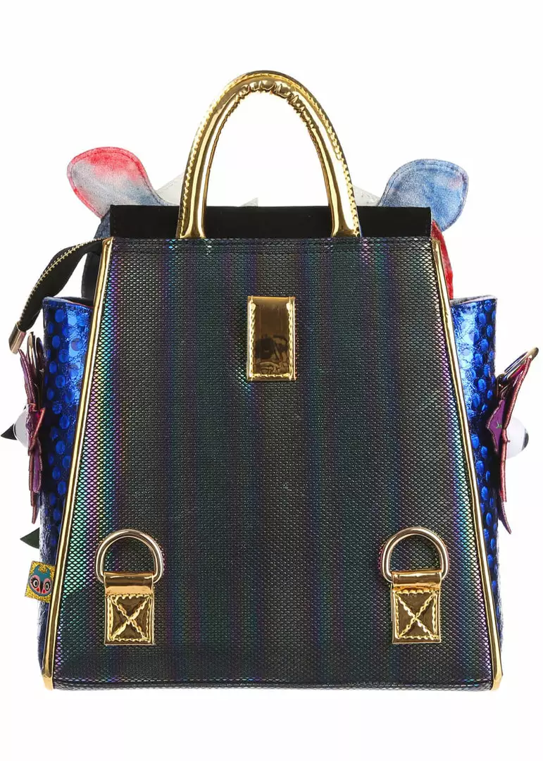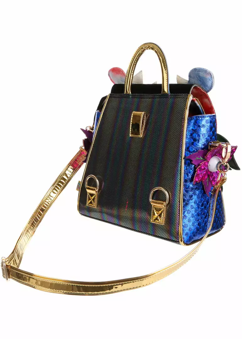The sides are covered in metallics and eyeball-flowers underneath the rings where you can attach the detachable shoulder strap. You can also click her strap on the back to turn her into a backpack. On the inside she’s large enough to fit a small waterbottle, your phone and other important things of the like. She has a velvet lining, zipper pocket and regular pocket.