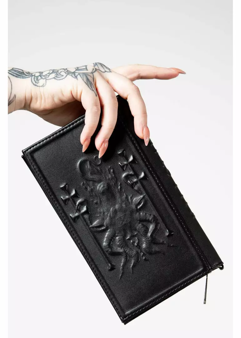 This gem has a stunning devil-relief on a wallet of high quality vegan leather, that keeps its shape nicely. She also has a short detachable handle, so you can wear her as a cluch.