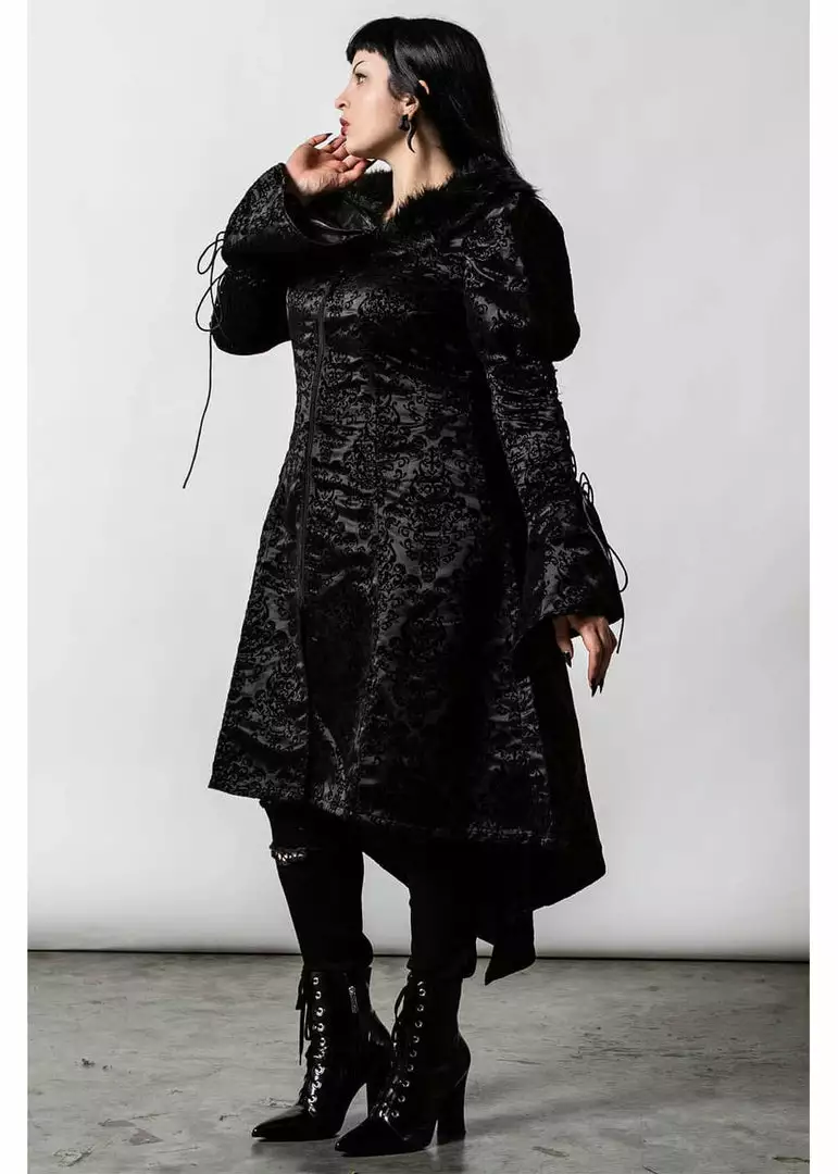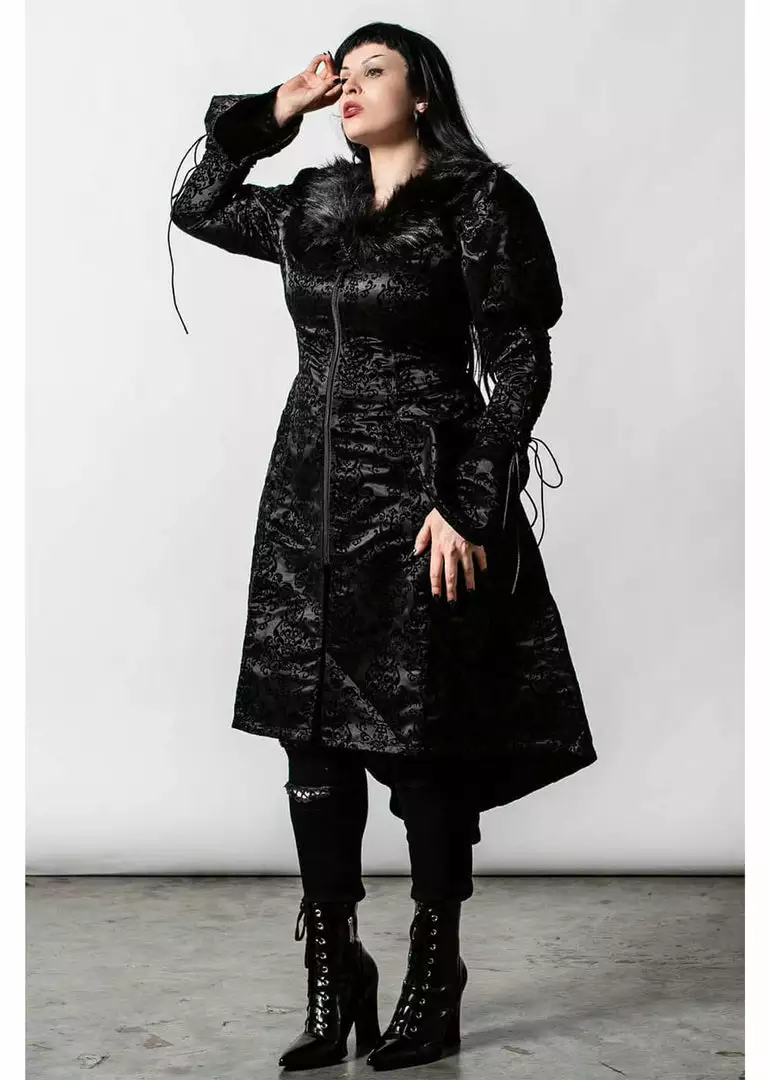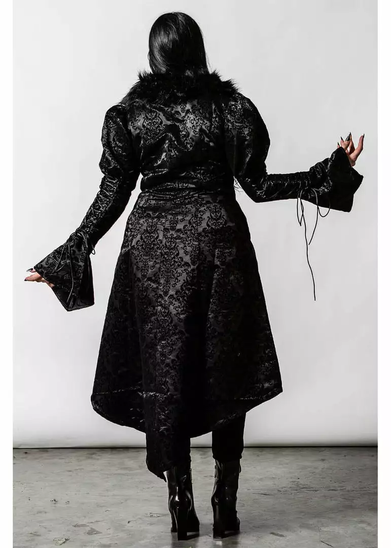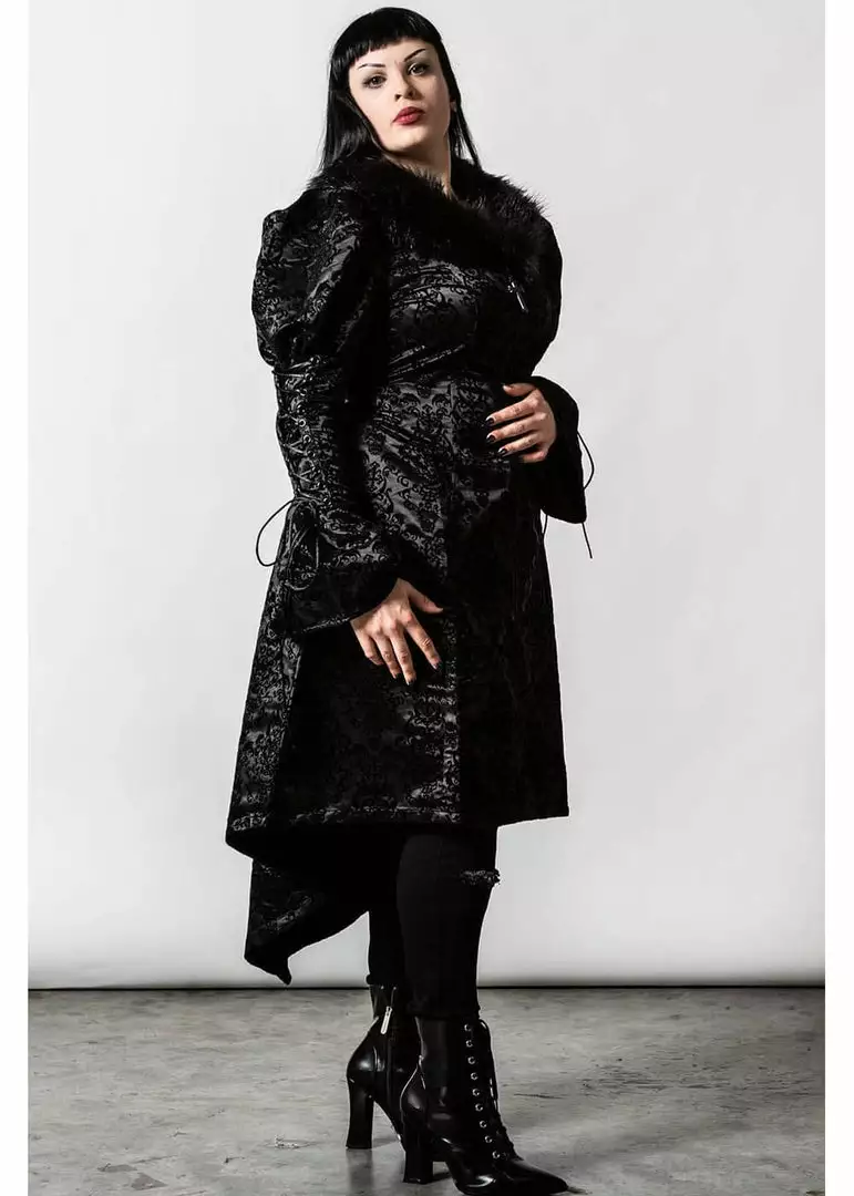 She has a VaVaVoom closefitting bodice with a neckline that is decorated with faux-fur, from where she flares into an elegant skirt with pockets that is a little longer in the back. Even the zipper is gorgeous with an elegant cross. This gem is lined and not padded.