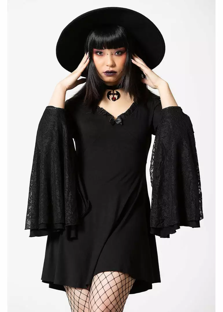 You’ll talk with your hands a lot, just to show off these breathtaking sleeves with lace! Her sweetheart neckline is adorned with a bow. The bodice is nicely close-fitting and has seams running across or just underneath the chest, from where she flares playfully into a skirt that ends above the knees for a height of 1,70 m.