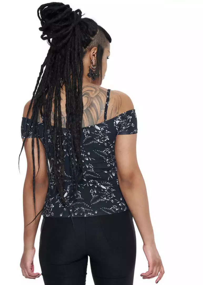 Exotic flowers surrounding skulls, on a Vavavoom close-fitting top: love at first sight! Lulu is the perfect Pin-Up top slim straps and off-shoulder sleeves.