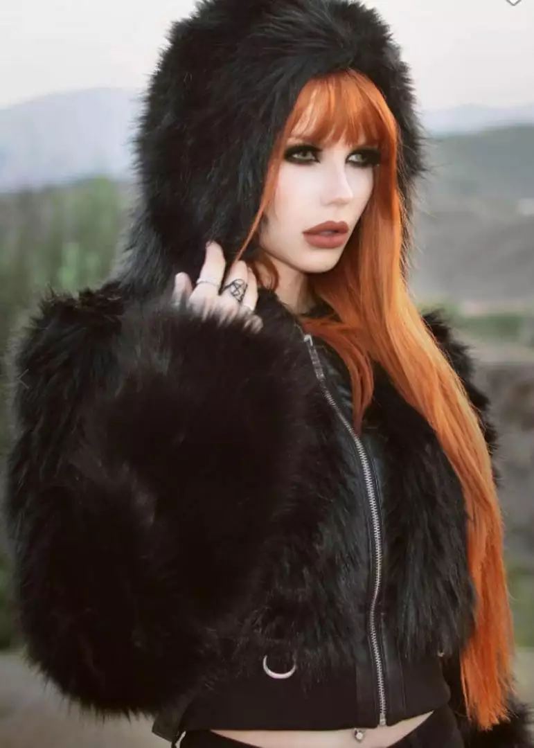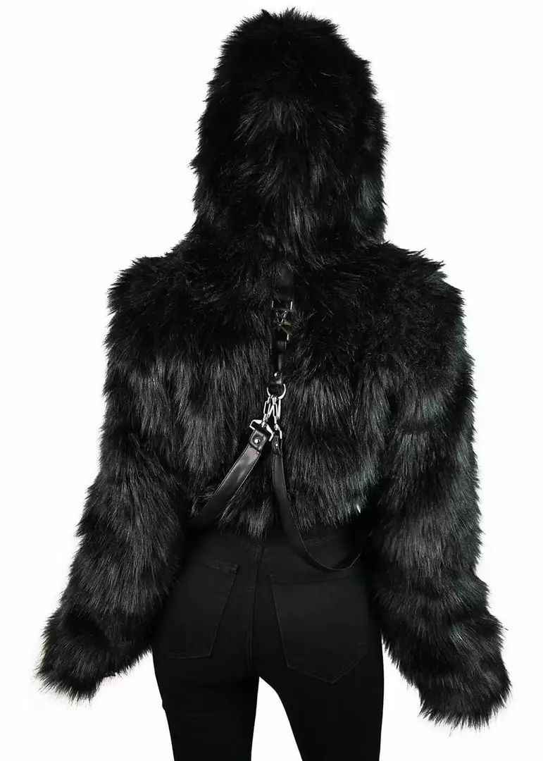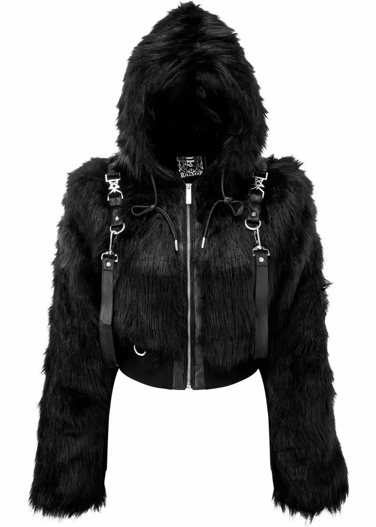 This fuzzy short model is so soft, you’ll never want to take her off again, and if you really want to dive into her you simply pull up the big hood 😉 The faux-leather straps are easily detachable, the pentagram details can’t be detached. She closes with a zipper in the front.