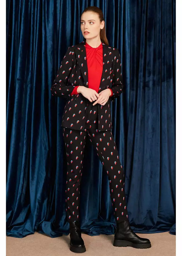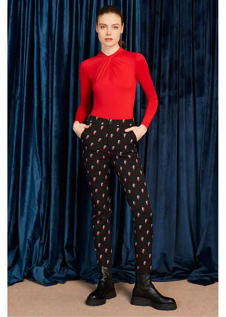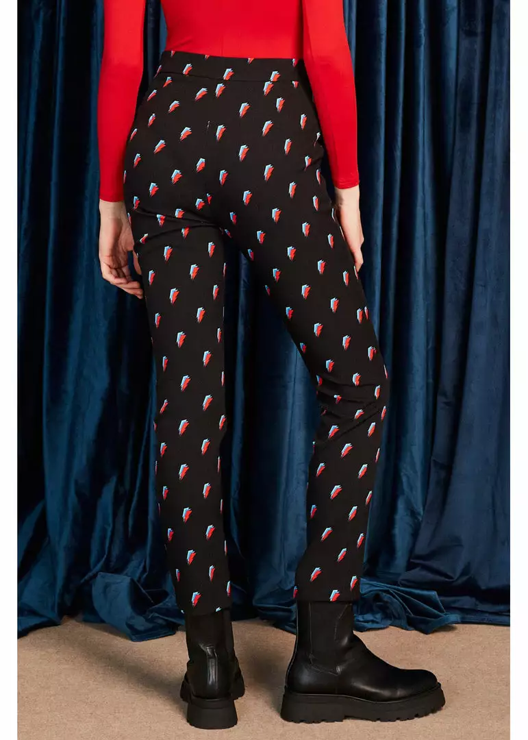 The David trousers are completely covered in bliksemschichten, for a sparky look 😉 This cutie is worn in the waist, from where she transforms into cflosefitting trouser legs, that end around the ankles for a height of 1,70 m. She’s made of a smooth fabric with fine stretch, that is lovely to wear. She closes with a zipper and button in the front.