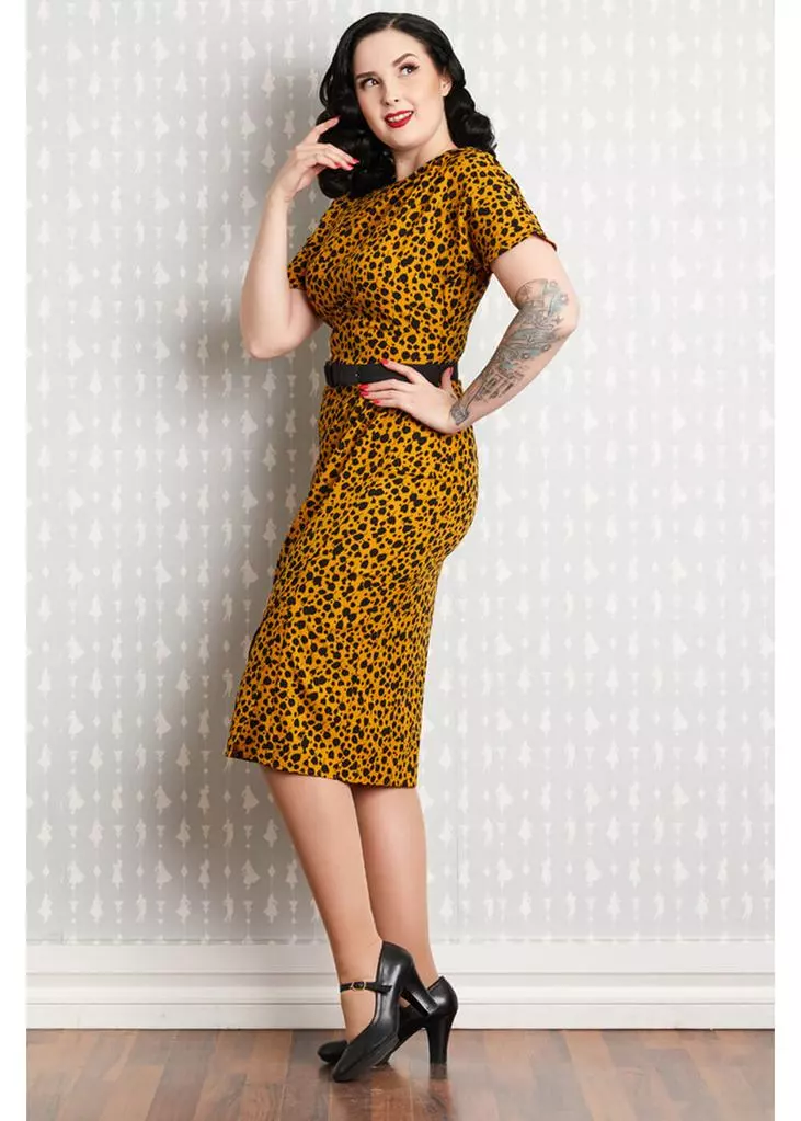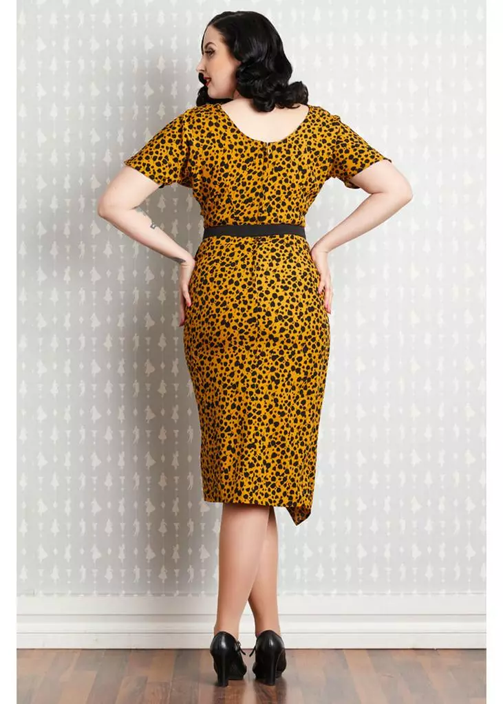 Her deep mustard is covered with spots that a leopard wouldn’t mind stealing. Filomena is a cutie, with her short sleeves with a pleated edge and playful pleats in the bodice. An extraordinary detail is that extra layer over the skirt, for a summery sarong look that playfully protrudes.