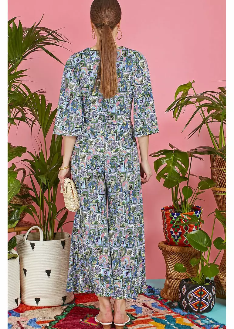 Our favorite jumpsuit has a pleated bodice which continues into a deep v-neck, and doesn’t reveal too much. You can accentuate the waistline using the detachable sash, but you can also use that same sash as a scarf or even a hairband! Down from which she continues into wide trouserlegs with pockets, which sway along to your every step. Stylish with some pumps, but incredibly cool with some 70’s platforms!
