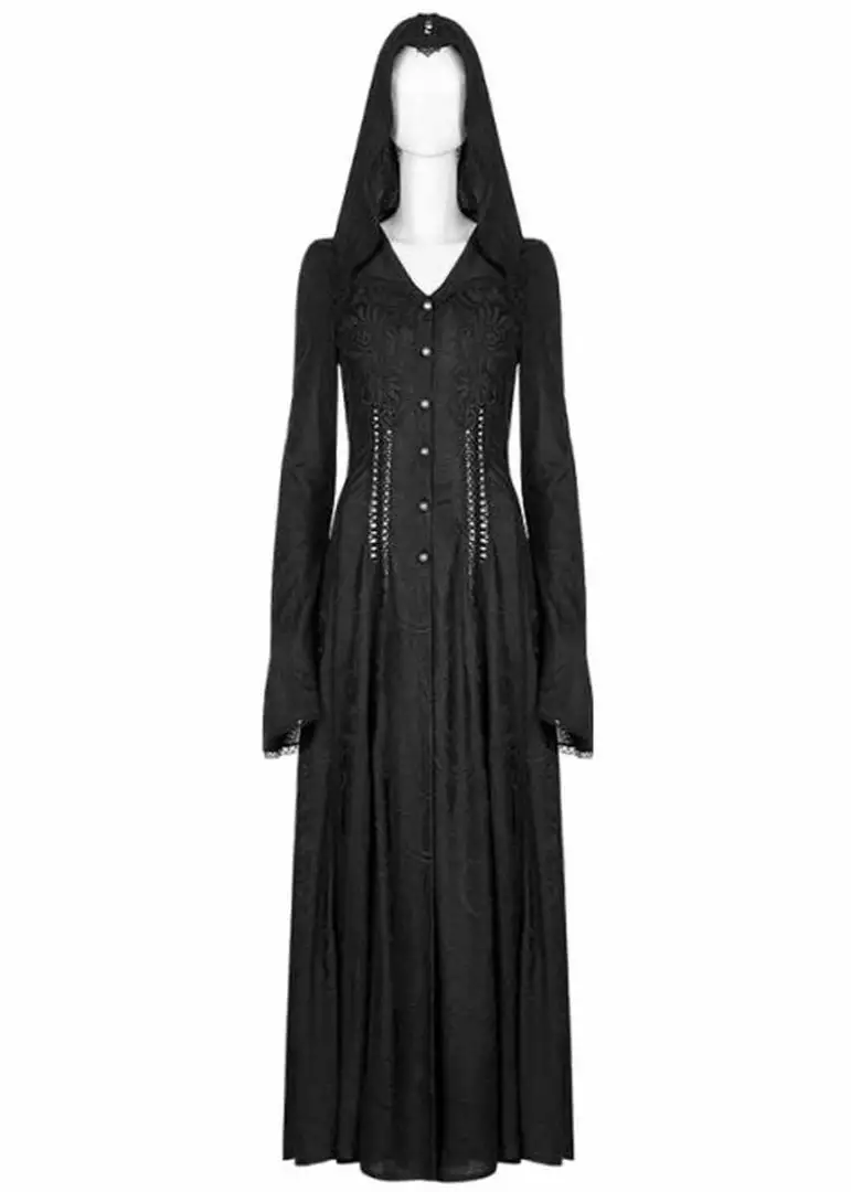 This beauty is made of a smooth fabric with a breathtaking pattern of plants with thorns and has stretch, which makes her fall gorgoeously heavy around your body. She closes withbuttons in the front underneath the low v-neck and falls open from there, so she’s perfect to be worn over another dress or leggings. The back is decorated with a delicate lacing and the long, flaring sleeves are adorned with a lace edge.