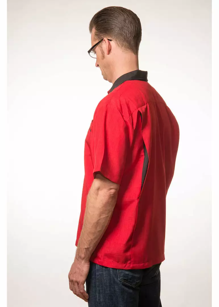 Rock Steady has been known worldwide for years because of their cool men’s blouses and shirts, and these button up shirts perfectly fit that. These shirts are red and have a pocket on the chest with a black rim. It closes with outstanding red shiny buttons. On the back the sleeves have a little extra room, so you can actually go bowling in these, or swing dancing!