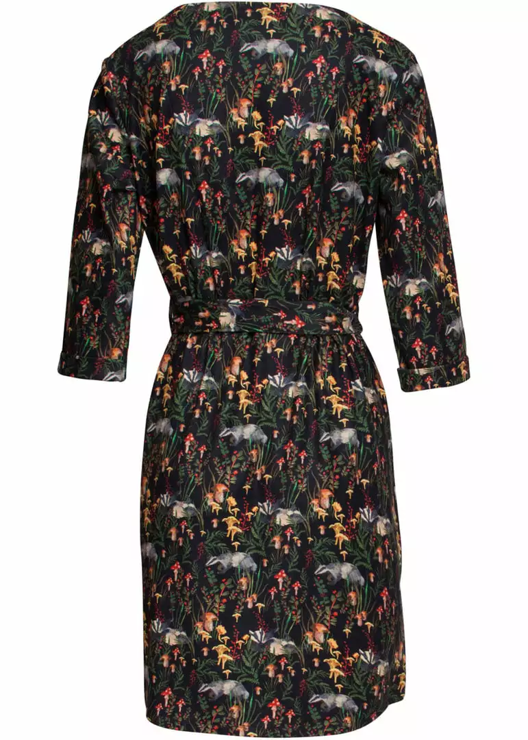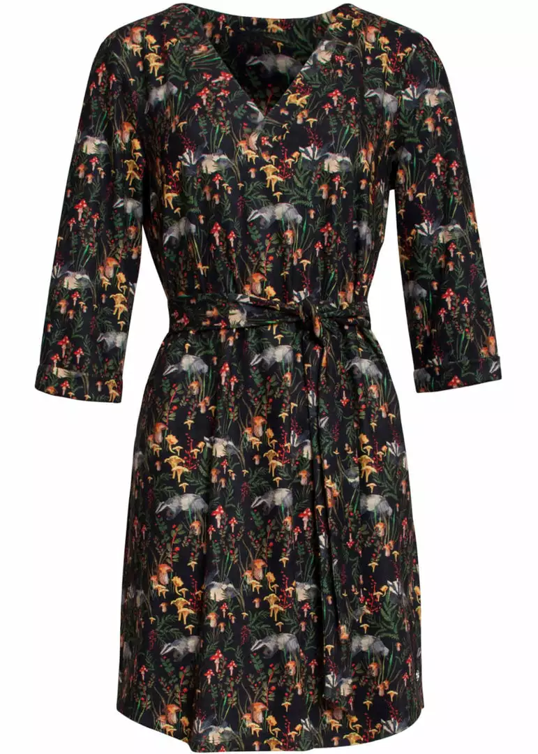 The waist of this otherwise straight model is accentuated with the removable sash of the same material, from where she continues straight until clearly above the knees for a height of 1.70 m. She doesn’t need a zipper, but she has pockets!