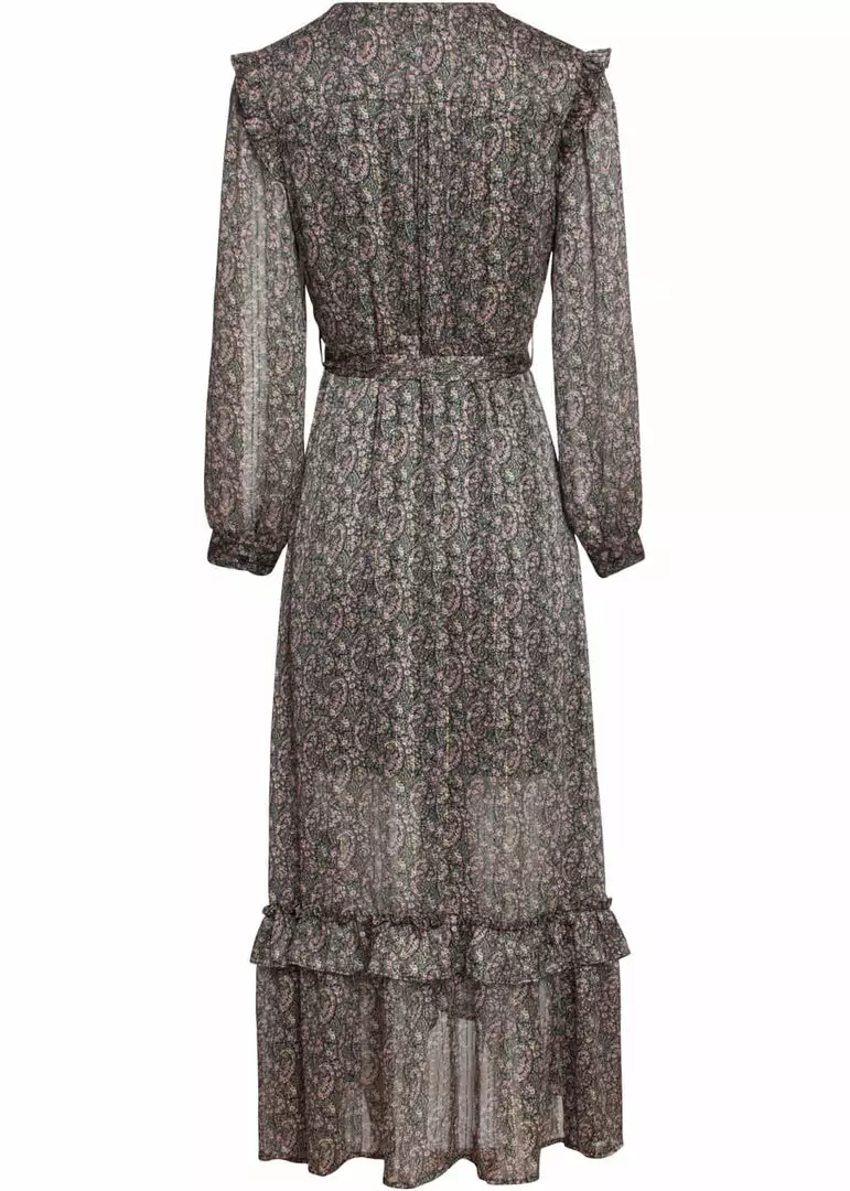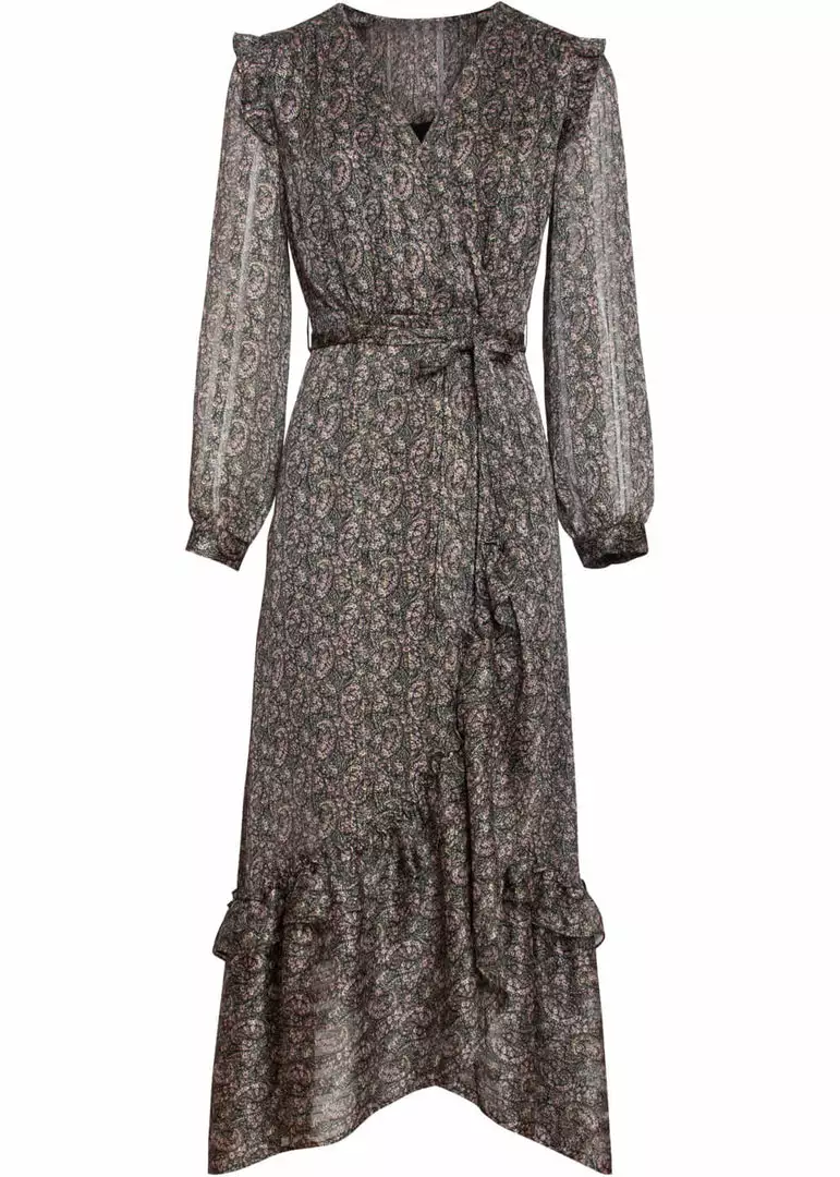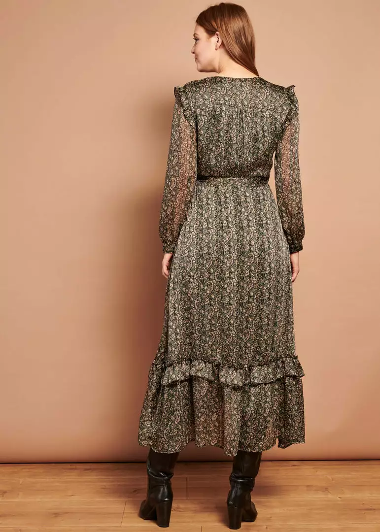 She’s a retro-gem with her paisley pattern and lurex that gives her a subtle gloss. And then the model, wow… She has an enticing v-neck, that you can see best in the pictures with the model, because the lining of the upper back has the same pattern. She flares into an elegant skirt that falls almost to your ankles for a height of 1.70m and she closes with a zipper on the side.