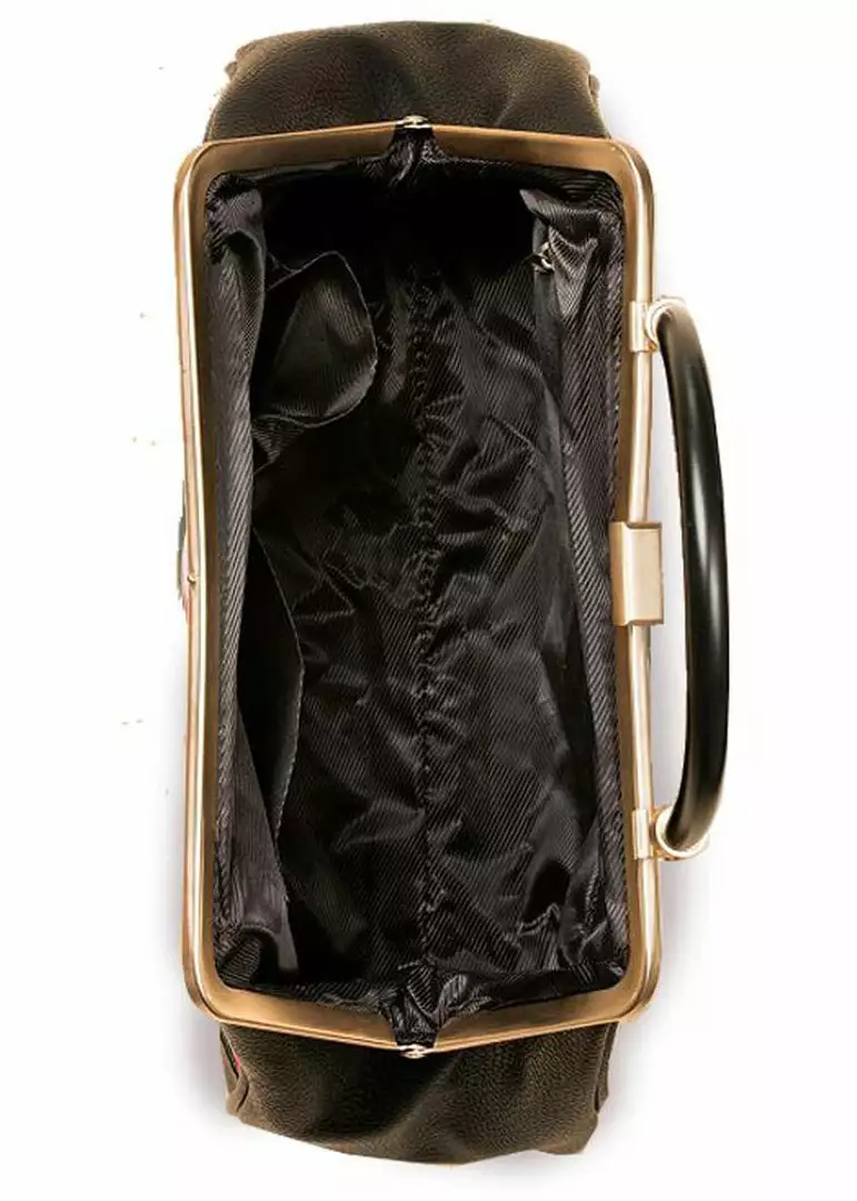 Her gold coloured, metal frame closes with a kiss-lock closure on the top. On the inside she has a zipper picket and a regular pocket, and enough room to store your (large) wallet, keys, phone and most imortant things.