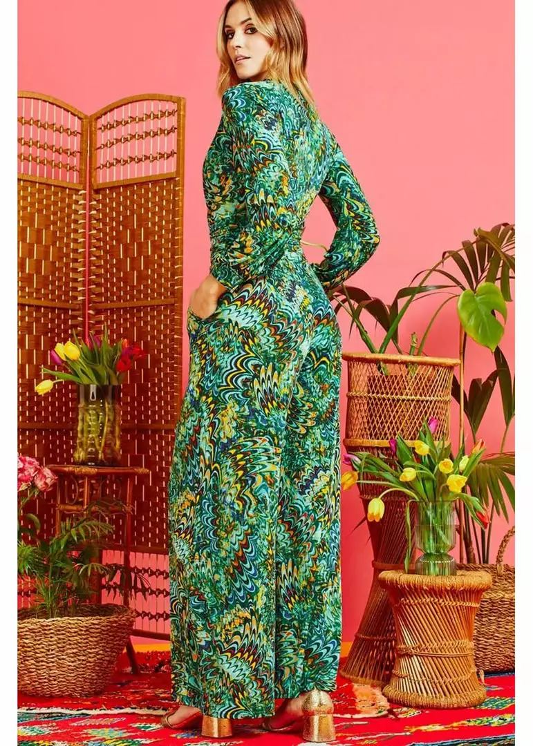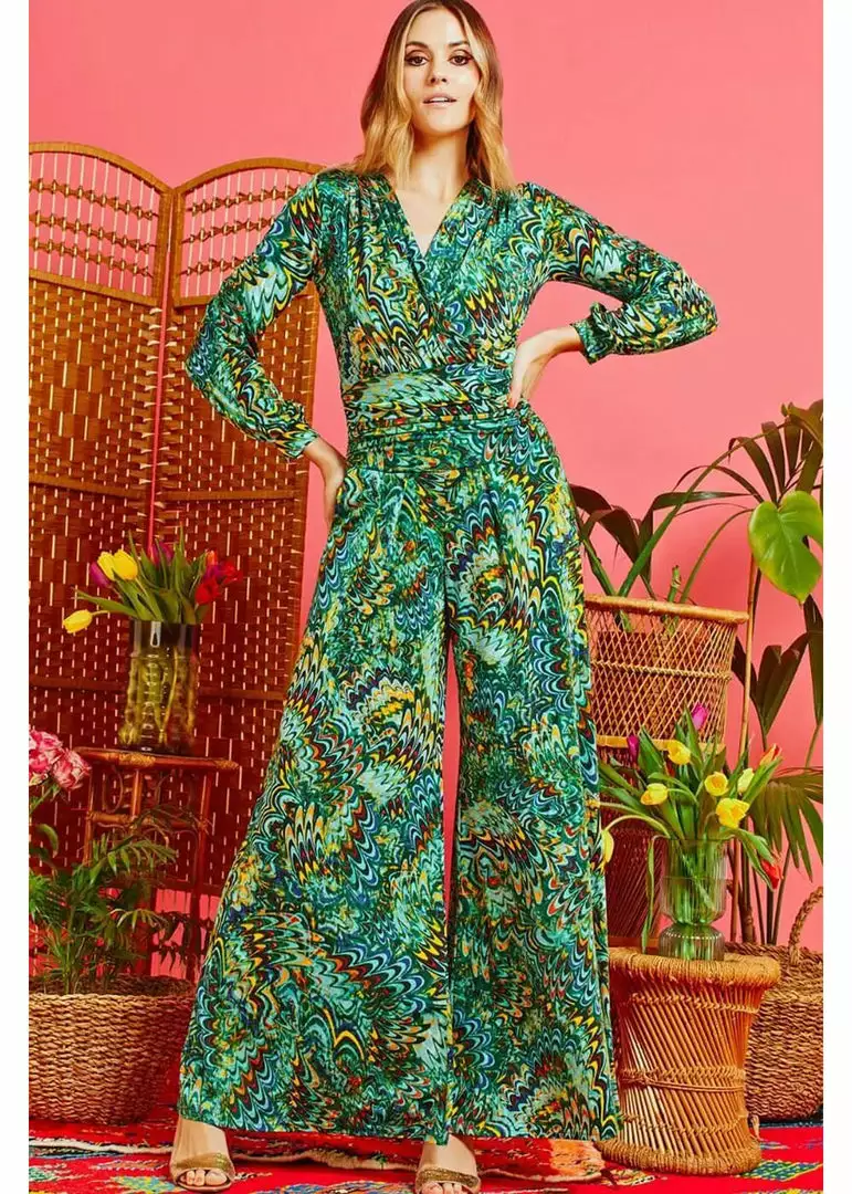 The bodice has a wrap and an elegant draping because of the pleats by the shoulders. From there, she flares into wide trouserlegs with pockets, which sway along to your every step. Stylish with some pumps, but incredibly cool with some 70’s platforms!