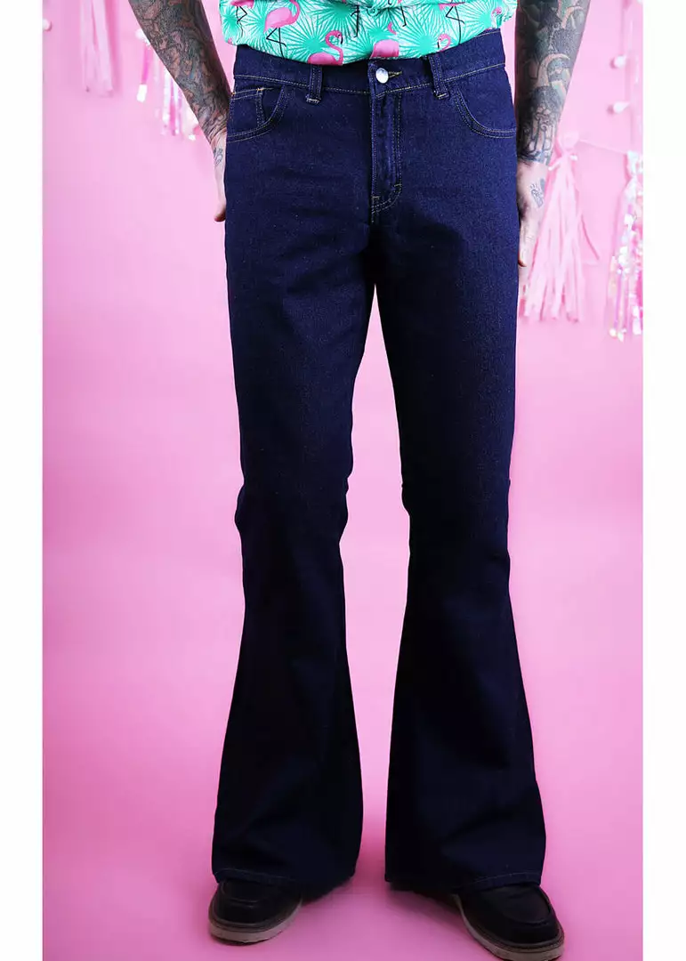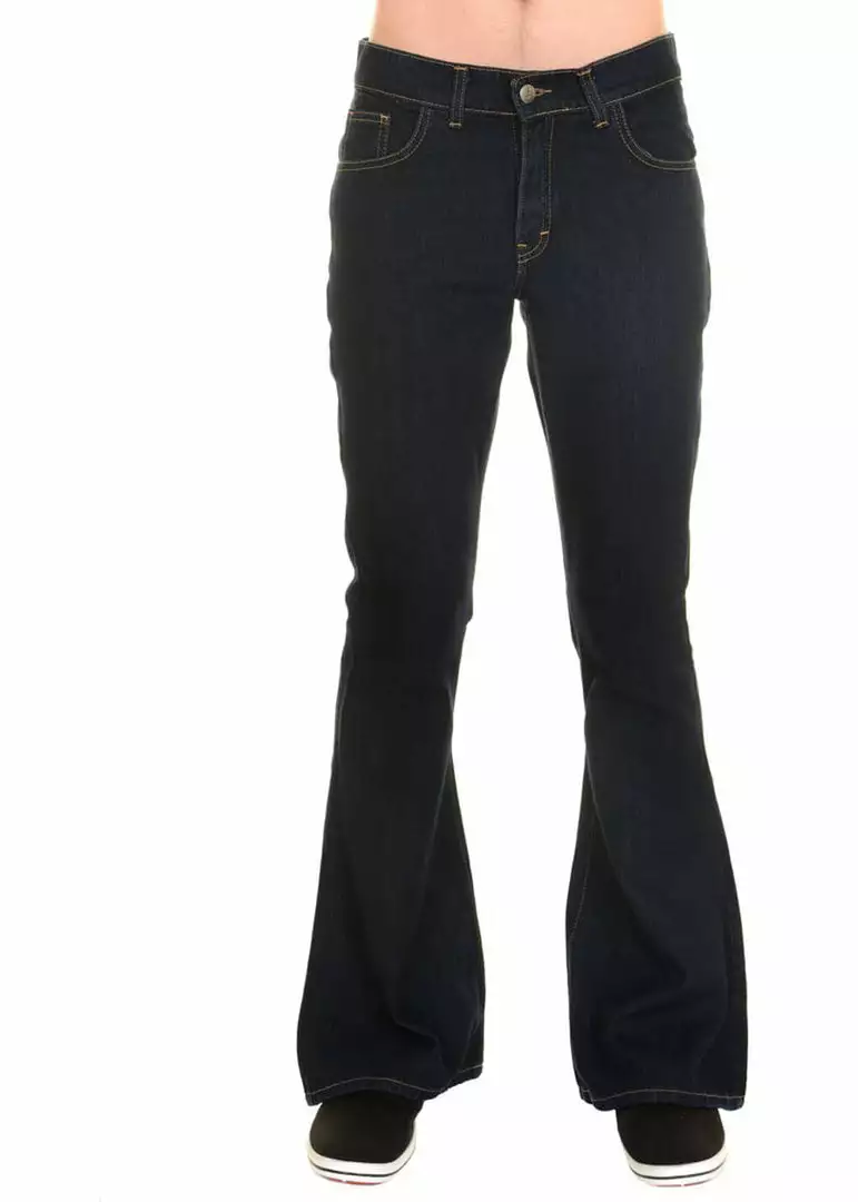 He seems to be coming from the 60’s or 70’s, with the denim-cotton without stretch in dark blue… This gem has a normal waist, a stright fit around the thighs, and flares widely from the knees down. It closes with a zipper and a button.
