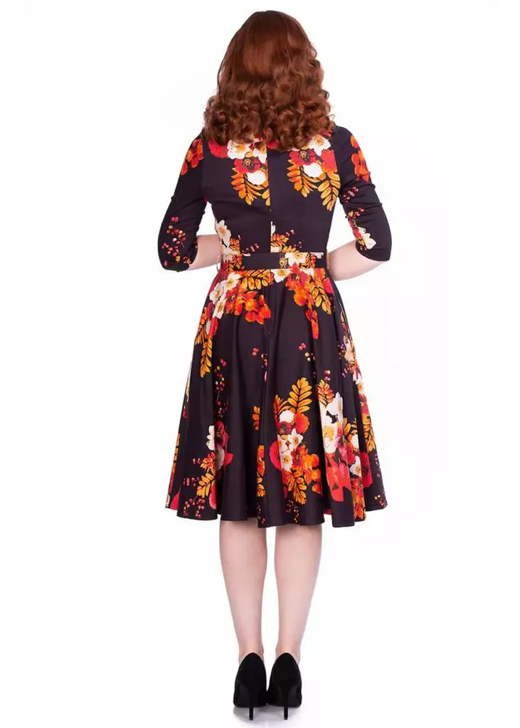 The waist is accentuated by the loose sash, down from which she flares out into a full skirt. She’s perfect for combining with one of our petticoats to make that bouquet come to life! With a height of 1,70 she reaches down to the knee and closes with a zipper on the back.