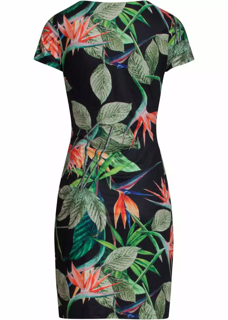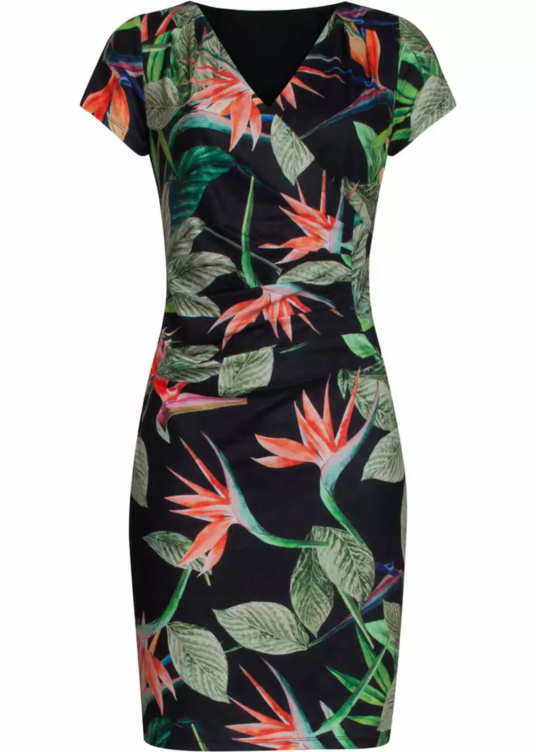You can’t miss the Bird of paradise flower on the extraordinarly soft fabric with stretch, luckily 😉 This beauty has short sleeves and a seductive overlap at the chest that transforms into the asymmetric draping on the front, which is perfect to hide a small tummy.