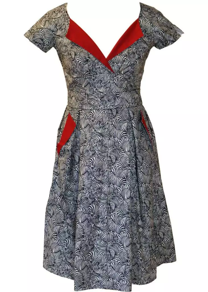 Het lijkt een leuk patroontje, maar dan zie je het…Zebra’s! De rode accenten geven een nog speelsere look, zoals de kraag en zakflapjes. Het zijn kleine zakjes, maar toch 😉
